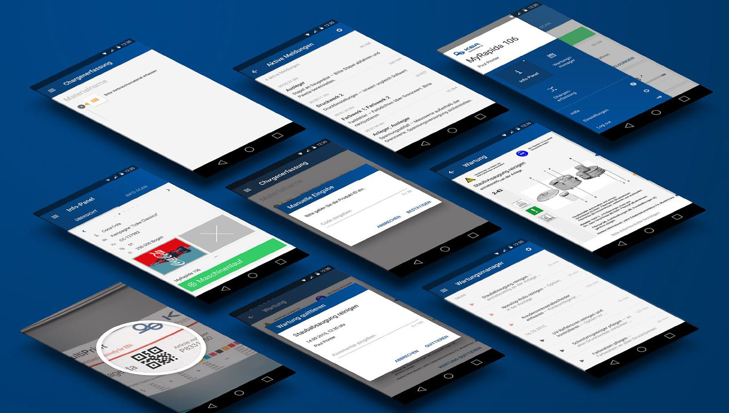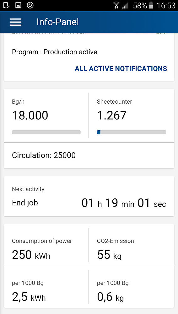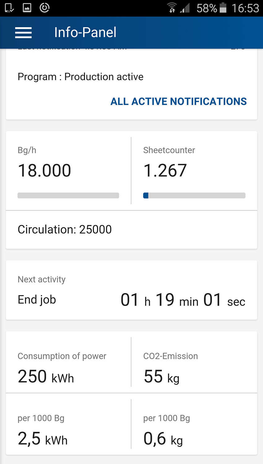 Neben dem Maschinenzustand informiert die LiveApp über alle Fakten zum Auftrag bis hin zu Energieverbrauch und CO2-Emission pro 1.000 Bogen. Mit der Chargenerfassung lassen sich Verbrauchsmittel wie Papier und Farbe über einen QR-Code bzw. manuell erfassen und den jeweiligen Druckjobs zuordnen. Der Verwendungsort – z. B. ein bestimmtes Farbwerk – wird automatisch erkannt und im Datensatz mit abgespeichert. Ob Druckfarbe, Bedruckstoff, Gummitücher oder Platten: alle Daten stehen für die Nachverfolgung bis zur Lagerverwaltung zur Verfügung. Und das ohne weite Wege. Die Daten werden vom mobilen Gerät an den Leitstand gesendet und automatisch über die LogoTronic Professional per JMF an die Branchensoftware übergeben.