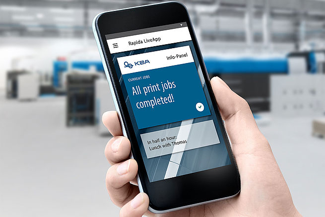 Operators are similarly more flexible than ever before when it comes to monitoring of the production process. They can now carry a mobile control console in their pocket. With a smartphone and the Rapida LiveApp, they are always in touch with their press – even while taking a coffee break in the canteen. A glance at the display provides details of the job which is currently in production and how much longer it will take to complete. The press crew can then decide at leisure when they need to be back at the press to load up the plates for the next job, for example.
